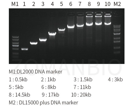 質(zhì)粒、λDNA等常規(guī)模板有效擴(kuò)增達(dá)40kb,cDNA有效擴(kuò)增達(dá)10kb,基因組有效擴(kuò)增達(dá)20kb。
