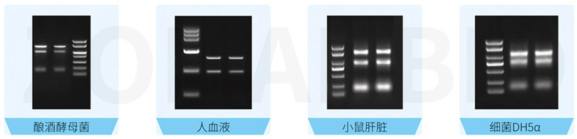 以上參考圖分別取50mg酵母濕菌、500μl人血液、20mg小鼠肝臟和1ml細(xì)菌DH5α菌液,組織進(jìn)行液氮研磨處理,菌液離心收集細(xì)胞后,分別按對(duì)應(yīng)試劑盒說(shuō)明書(shū)進(jìn)行RNA提取。洗脫體積分別為100μl、60μl、60μl、80μl。RNA電泳上樣量分別為5μl,1%瓊脂糖凝膠電泳。M: DL2000(ZOMANBIO) 人血液RNA圖為MarkerⅥ(ZOMANBIO) | |||||