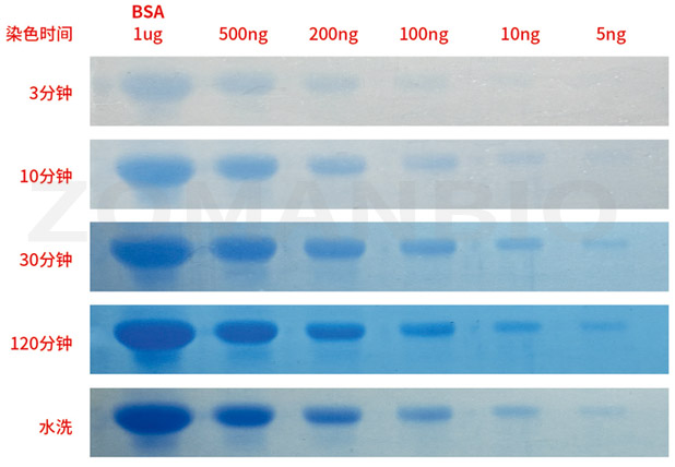 泡染2-10min即可觀察蛋白大??;且安全無(wú)毒無(wú)刺激性氣味。