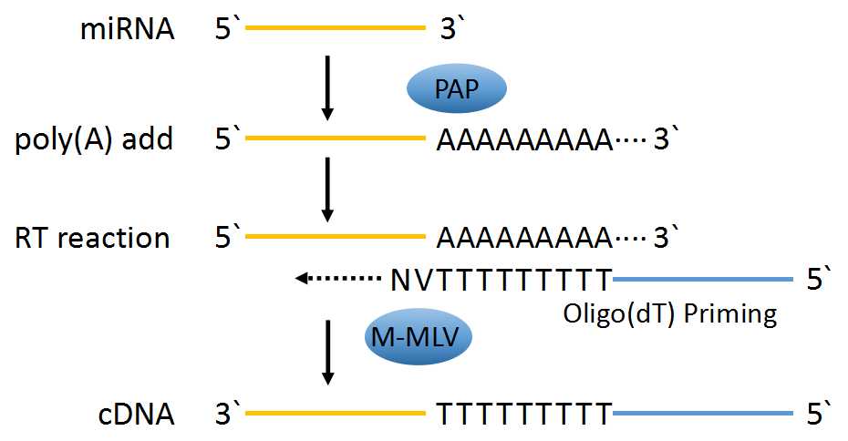 本產品以總RNA或miRNA為模板,先通過Poly(A)聚合酶在miRNA的3`端加多聚A尾,隨后使用Universal Oligo(dT) Primer進行逆轉錄反應,最終生成miRNA對應的cDNA第一鏈。