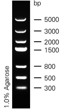 本產(chǎn)品是由7條線性雙鏈DNA條帶組成,適用于瓊脂糖凝膠電泳中DNA條帶的分析。產(chǎn)品中已含有1×loading buffer,可根據(jù)實(shí)驗(yàn)需要,直接取2-5μl電泳,使用方便,電泳圖像清晰。7條帶的大小分別為300,500,800,1500,2000,3000,5000bp。其中1500bp條帶約為100ng/5μl,顯示加亮帶,其余條帶濃度約為50ng/5μl。