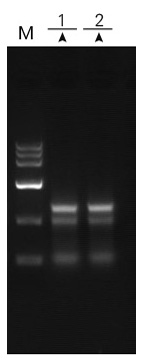 | 1%瓊脂糖凝膠電泳 1:89.2mg小麥莖 2:101.4mg馬鈴薯莖
