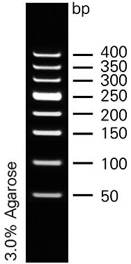 本產(chǎn)品是由8條線性雙鏈DNA條帶組成,適用于瓊脂糖凝膠電泳中DNA條帶的分析。本產(chǎn)品為即用型產(chǎn)品,已含有1×loading buffer,可根據(jù)實(shí)驗(yàn)需要,直接取2-5μl電泳,使用方便,電泳圖像清晰。本產(chǎn)品中8條帶分為50,100,150,200,250,300,350,400bp,其中250bp條帶約為100ng/5μl,顯示加亮帶,其余條帶濃度約為50ng/5μl。