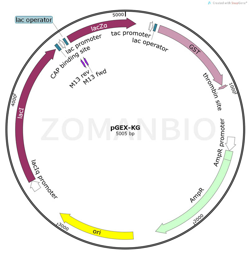 pGEX-KG載體大小為5005bp,能夠在Amp的平板上生長(zhǎng);含有GST標(biāo)簽,能夠用GST親和柱純化重組蛋白。質(zhì)粒只保證關(guān)鍵序列正確,不保證表達(dá)效果。