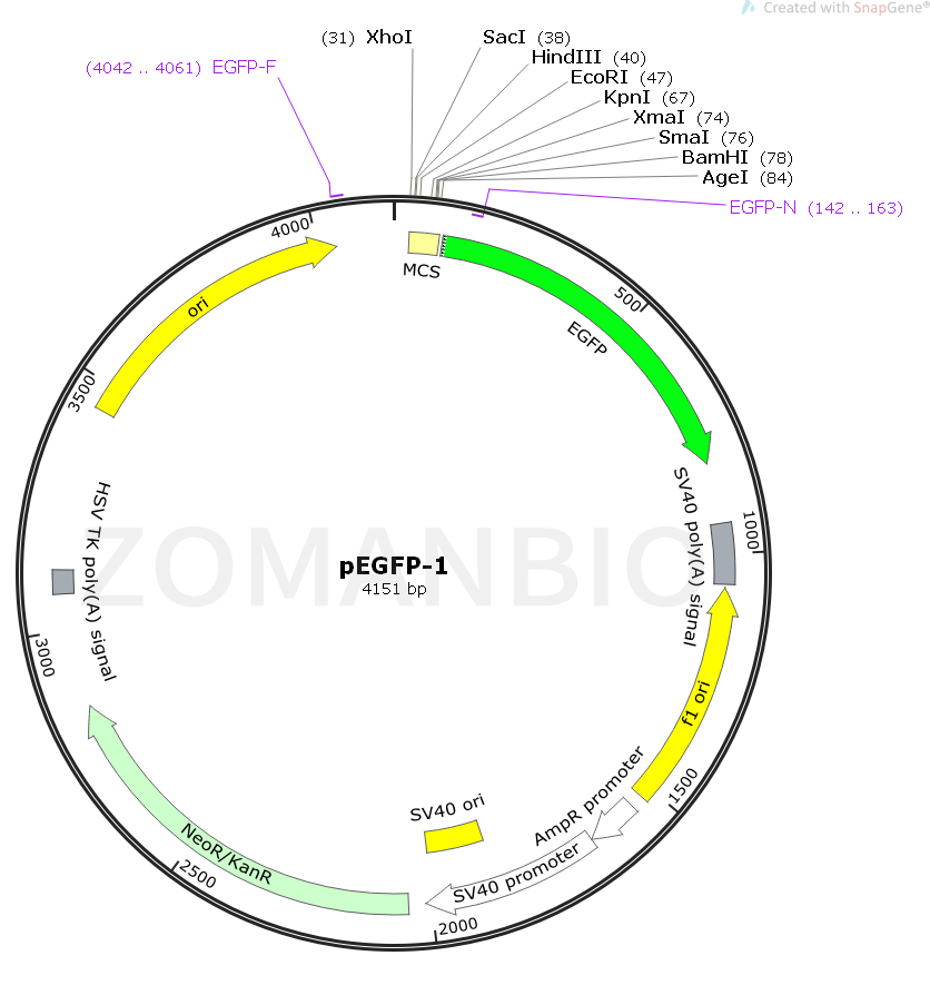 pEGFP-1編碼野生型GFP(1-3)的紅移型變體,其已經(jīng)針對(duì)更明亮的熒光和哺乳動(dòng)物細(xì)胞中更高的表達(dá)進(jìn)行了優(yōu)化。(激發(fā)最大值= 488nm;發(fā)射最大值= 507nm)pEGFP-1骨架還提供了用于在大腸桿菌中繁殖的pUC起始點(diǎn)和用于單鏈DNA生產(chǎn)的f1起源。