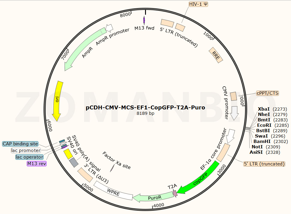 PCDH-CMV-MCS-EF1-CopGFP-T2A-Puro polyclonal site (MCS) - in MCS is located in the CMV promoter downstream of interest gene cloning.To improve stability and CMV driven transcription translation. SV40 multi - poly adenosine acidification signal to enable the efficiency of transcription and transcription termination. The hybrid / RSV 5ltr promoter provides a high level of viral transcript expression in 293 cells of this full-length producer.