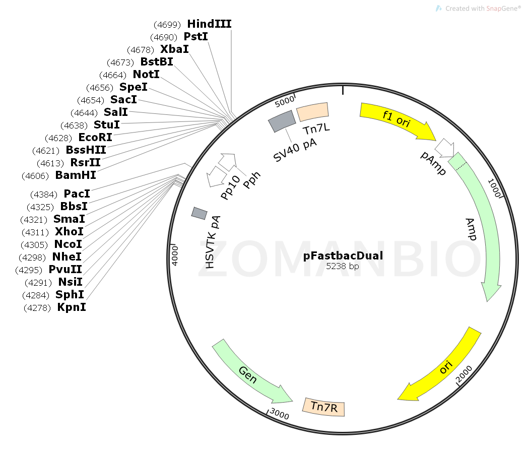 pFastBac Dual昆蟲細(xì)胞表達(dá)載體包含有兩個(gè)啟動(dòng)子,能夠同時(shí)表達(dá)兩個(gè)外源基因,一個(gè)表達(dá)基因是polyhedrin (PH)啟動(dòng)子控制,另一個(gè)外源基因是由p10啟動(dòng)子控制。