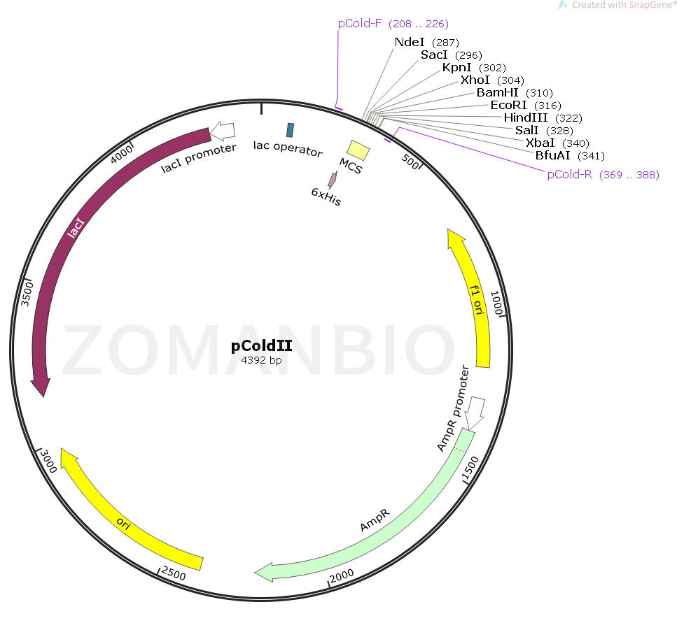 pColdII質(zhì)粒是利用冷休克基因CSPA啟動子設計高效率蛋白質(zhì)表達載體。在E.COLI啟動子下游處,插入了lac操縱子,以便嚴格控制表達。此外,5’非翻譯區(qū)(5’UTR),翻譯增強元件(TEE),His標簽序列,Xa因子切割位點和多克隆位點(MCS)位于CAPS啟動子的下游。當培養(yǎng)溫度切換到低溫時,大腸桿菌暫時停止生長,大部分的大腸桿菌蛋白質(zhì)表達減少,但是一類稱為冷休克蛋白的蛋白質(zhì)被特異性誘導表達。