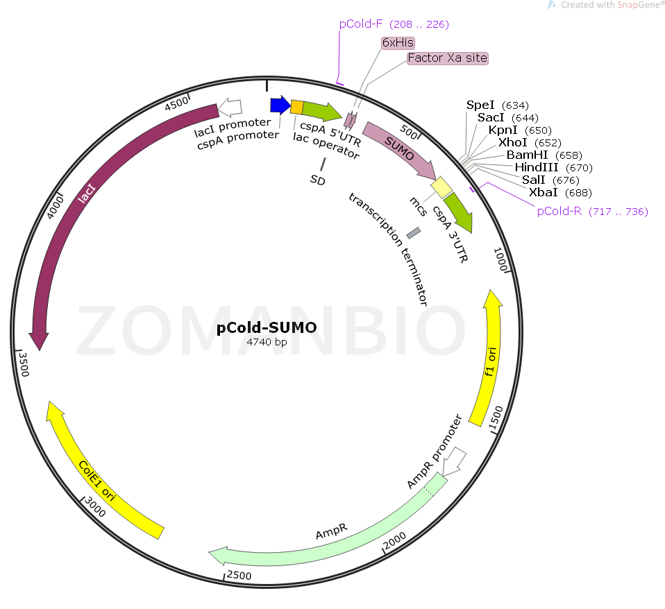 pCold-SUMO質粒是利用冷休克基因CSPA啟動子設計高效率蛋白質表達載體。在E.COLI啟動子下游處,插入了lac操縱子,以便嚴格控制表達。此外,5’非翻譯區(qū)(5’UTR),翻譯增強元件(TEE),His標簽序列,Xa因子切割位點和多克隆位點(MCS)位于CAPS啟動子的下游。當培養(yǎng)溫度切換到低溫時,大腸桿菌暫時停止生長,大部分的大腸桿菌蛋白質表達減少,但是一類稱為冷休克蛋白的蛋白質被特異性誘導表達。