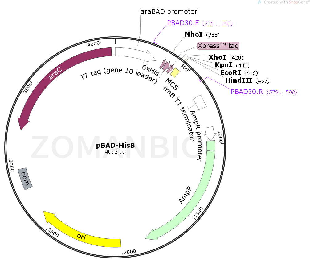 pBAD-HisB質(zhì)粒是衍生于pBR322載體。載體設計用來在大腸桿菌中進行可調(diào)節(jié),劑量依賴性的表達和純化重組目的蛋白。使大腸桿菌araBAD啟動子(pBAD)增強了大腸桿菌重組蛋白可溶性表達的水平。pBAD/His和pBAD/Myc His載體上的調(diào)節(jié)蛋白AraC能夠調(diào)控pBad啟動子。pBAD/Myc-His B 載體是阿拉伯糖調(diào)控載體,在無葡萄糖的培養(yǎng)基中,阿拉伯糖正向調(diào)控目的基因的表達,通過調(diào)節(jié)阿拉伯糖的濃度水平來優(yōu)化目的蛋白的可溶性表達。