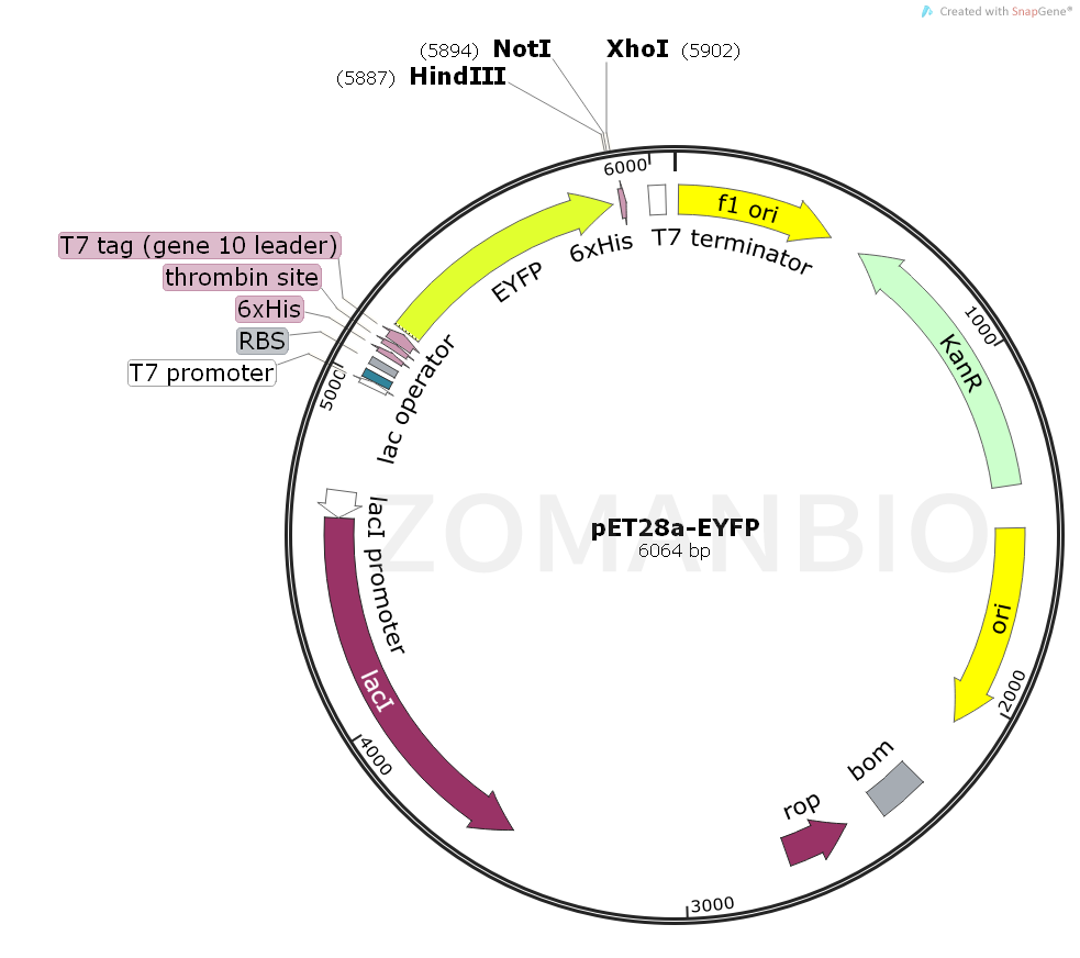 pET28a-EYFP質(zhì)粒是一種原核表達(dá)載體,C端含有一個6×His標(biāo)簽,N端含有一個thrombin位點(diǎn)、6×His標(biāo)簽、T7標(biāo)簽和EYFP標(biāo)簽。該質(zhì)粒含有多個常用的酶切位點(diǎn),便于不同基因克隆。表達(dá)由宿主細(xì)胞提供的T7 RNA聚合酶誘導(dǎo),目的基因被克隆到質(zhì)粒載體上,受噬菌體強(qiáng)轉(zhuǎn)錄及翻譯信號控制。