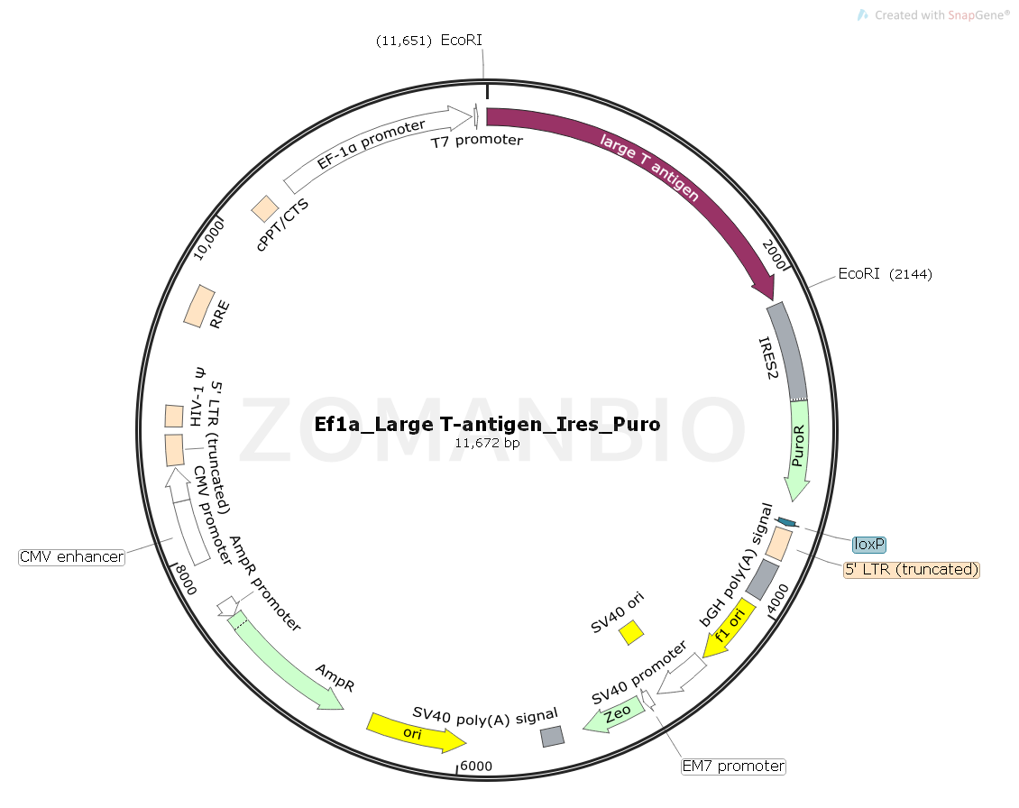 Ef1a_Large T-antigen_Ires_Puro是一個(gè)哺乳細(xì)胞慢病毒大T抗原表達(dá)質(zhì)粒。
