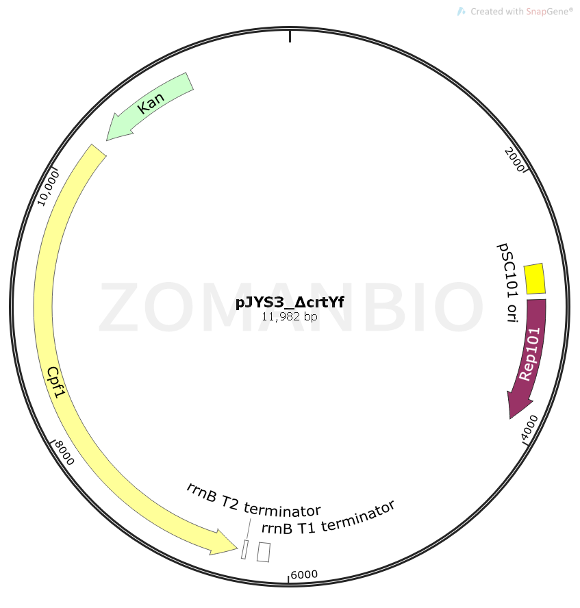 質(zhì)粒序列請(qǐng)下載:ZK1869 pJYS3_ΔcrtYf大腸敲除質(zhì)粒.txt